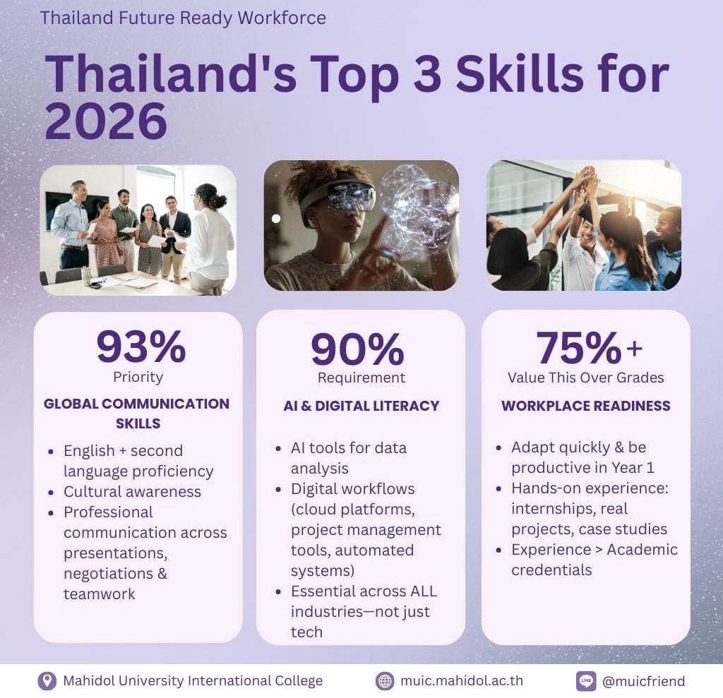 ศาสตราจารย์ แพทย์หญิงจุฬธิดา โฉมฉาย คณบดี วิทยาลัยนานาชาติ มหาวิทยาลัยมหิดล (MUIC) เปิดเผยข้อมูลจากรายงาน Annual Graduate Employer Survey 2025 ซึ่งรวบรวมความคิดเห็นจากบัณฑิตจำนวน 412 คน ควบคู่กับผู้ประกอบการ และผู้ว่าจ้าง จากองค์กรชั้นนำจำนวน 63 แห่งครอบคลุมอุตสาหกรรมสำคัญ เช่น ธุรกิจบริการ โรงแรม, การให้คำปรึกษา, เทคโนโลยีซอฟต์แวร์ รวมถึงผู้บริหารจากหน่วยงานภาครัฐ รัฐวิสาหกิจ องค์กรระหว่างประเทศ เช่น องค์การสหประชาชาติ ตลอดจนอาจารย์ที่ปรึกษาของบัณฑิตที่ศึกษาต่อในต่างประเทศ ทั้งสองชุดข้อมูลสะท้อนเทรนด์ความต้องการแรงงานในอนาคต โดยนายจ้างในประเทศไทยให้ความสำคัญกับทักษะหลัก 3 ด้าน ซึ่งจะเป็น “หัวใจของความพร้อมในการทำงาน” ได้แก่