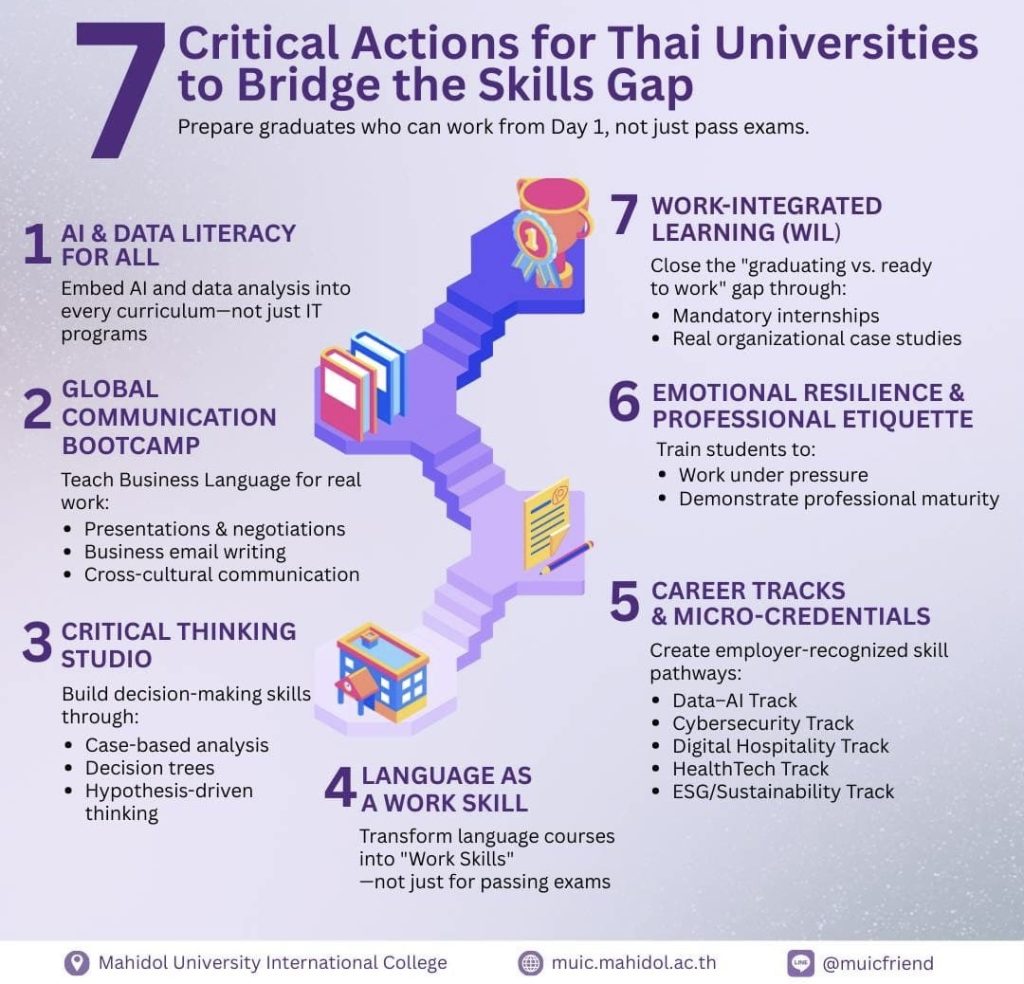 7. Language as an Economic Skill: ปรับวิชาภาษาให้เป็น “วิชาทักษะทำงาน” ไม่ใช่เพื่อสอบเท่านั้น แต่เป็นภาษาเพื่อการสื่อสารในงานจริง การสรุปงาน การเจรจา และการนำเสนอ