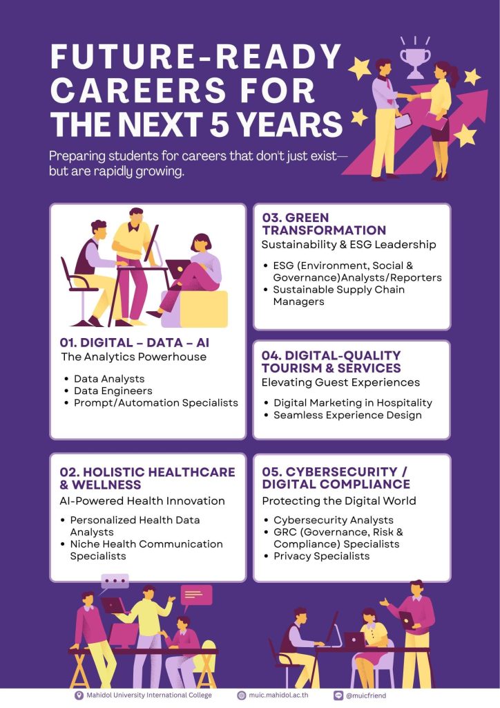 ทั้งนี้ MUIC ได้ทำการวิเคราะห์จากข้อมูลข้างต้น และมีข้อสรุปออกมาว่า 5 กลุ่มสายอาชีพที่จะเติบโตสูงใน 5 ปีข้างหน้า ได้แก่ 1. ดิจิทัล – ข้อมูล – AI เช่น นักวิเคราะห์ข้อมูล, วิศวกรข้อมูล, ผู้เชี่ยวชาญด้าน Prompt/Automation   2.ความมั่นคงปลอดภัยไซเบอร์ / การปฏิบัติตามข้อกำหนดด้านดิจิทัล (Digital Compliance) เช่น นักวิเคราะห์ความปลอดภัยไซเบอร์, ผู้เชี่ยวชาญด้าน GRC (Governance, Risk & Compliance)/Privacy 3. การท่องเที่ยว–บริการเชิงคุณภาพแบบดิจิทัล เช่น การตลาดดิจิทัลในธุรกิจโรงแรม, การออกแบบประสบการณ์ (Experience Design) ให้ผู้เข้าพักประทับใจตั้งแต่ต้นจนจบ  4. การดูแลสุขภาพแบบองค์รวมที่เน้นการป้องกันและการสร้างคุณภาพชีวิตที่ดีอย่างยั่งยืน (Healthcare and Wellness) โดยใช้ AI และ เครื่องมือดิจิทัล เช่น การวิเคราะห์ข้อมูลสุขภาพรายบุคคล, การสื่อสารด้านสุขภาพเฉพาะกลุ่ม และ 5. การปรับเปลี่ยนเศรษฐกิจและสังคมให้เป็นมิตรต่อสิ่งแวดล้อมและยั่งยืนมากขึ้น (Green transformation) เช่น นักวิเคราะห์และจัดทำรายงานประเมินด้านความยั่งยืนหรือ ESG (Environment, Social & Governance), การจัดการห่วงโซ่อุปทานที่ยั่งยืน)