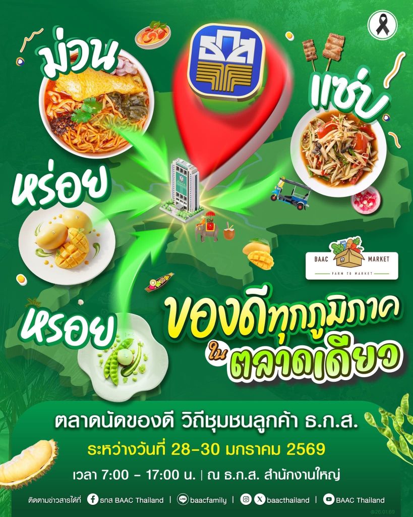ธ.ก.ส. ยกขบวนสินค้าเกษตร สินค้าชุมชน และผลิตภัณฑ์แปรรูปคุณภาพ ที่มีเอกลักษณ์เฉพาะถิ่น ส่งตรงจากเกษตรกรและผู้ประกอบการลูกค้า ธ.ก.ส. ถึงมือผู้บริโภคโดยตรงกว่า 60 ร้านค้าทั่วทุกภูมิภาค รวมไว้ในงานตลาดนัดของดีวิถีชุมชน ภายใต้ธีม “ของดีภูมิภาค” ระหว่างวันที่ 28 – 30 มกราคม 2569 ณ บริเวณด้านหน้า ธ.ก.ส. สำนักงานใหญ่ กรุงเทพ