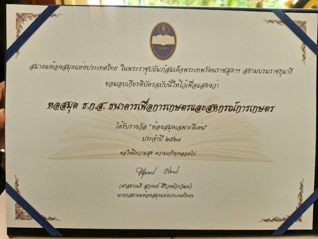 ธ.ก.ส. คว้ารางวัล “ห้องสมุดเฉพาะดีเด่น” ประจำปี 2568