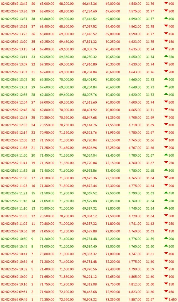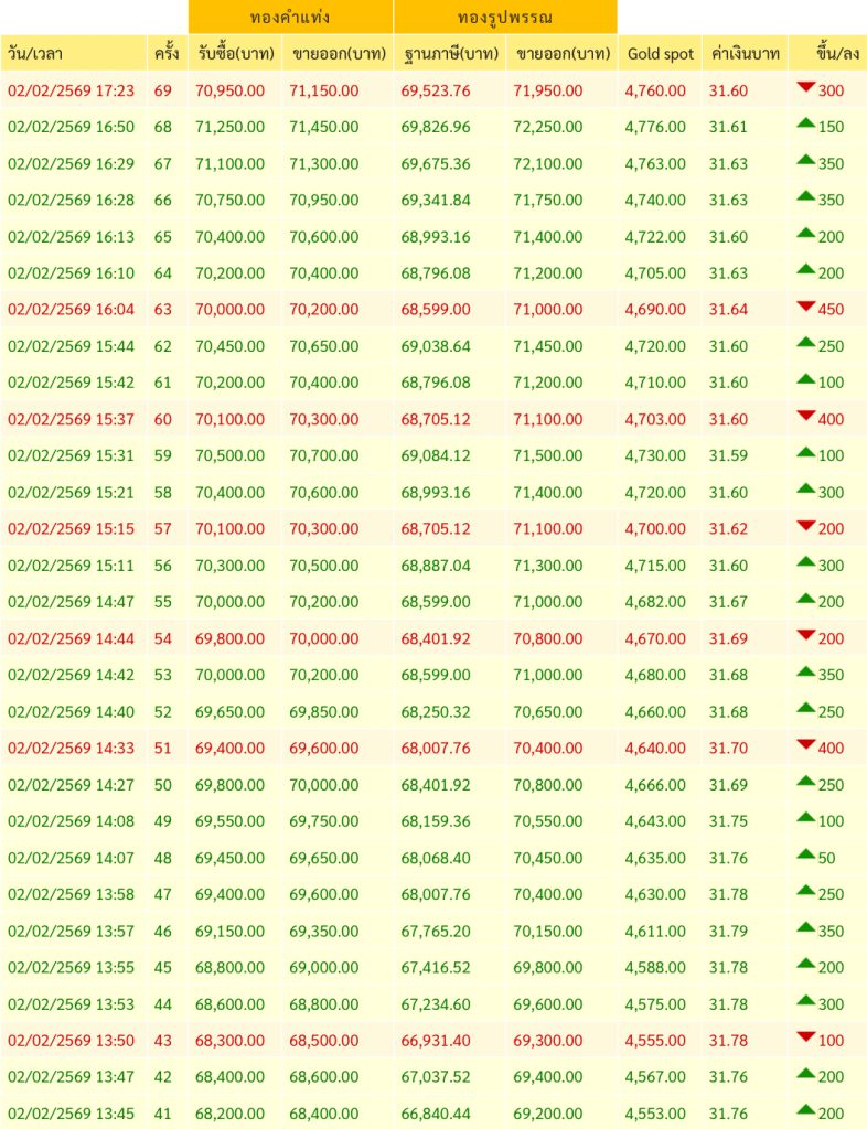 รายงานราคาทอง (ทองคำ 96.5%) ประจำวันที่ 2 ก.พ. 2569 ตามประกาศของสมาคมค้าทองคำ วันนี้ราคาทองมีการปรับเปลี่ยนระหว่างวันหลายรอบ มีรายละเอียดดังนี้