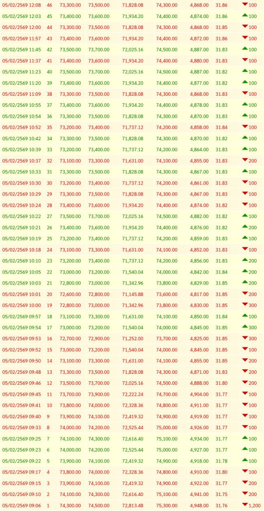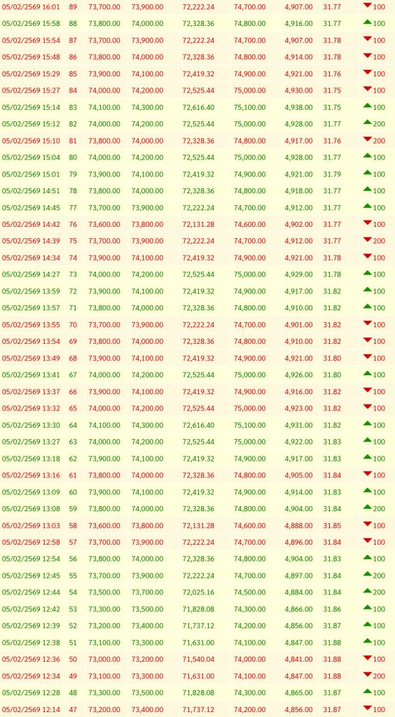 รายงานราคาทอง (ทองคำ 96.5%) ประจำวันที่ 5 ก.พ. 2569 ตามประกาศของสมาคมค้าทองคำ วันนี้ราคาทองมีการปรับเปลี่ยนระหว่างวันหลายรอบ มีรายละเอียดดังนี้