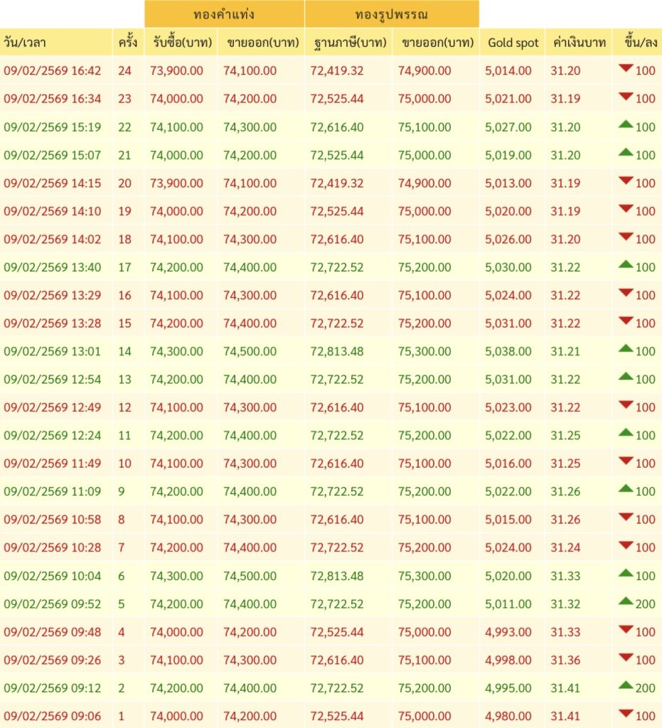 รายงานราคาทอง (ทองคำ 96.5%) ประจำวันที่ 9 ก.พ. 2569 ตามประกาศของสมาคมค้าทองคำ วันนี้ราคาทองมีการปรับเปลี่ยนระหว่างวันหลายรอบ มีรายละเอียดดังนี้