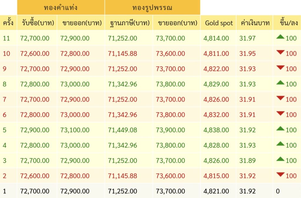 • ทองคำแท่งขายออกบาทละ 72,900 บาท