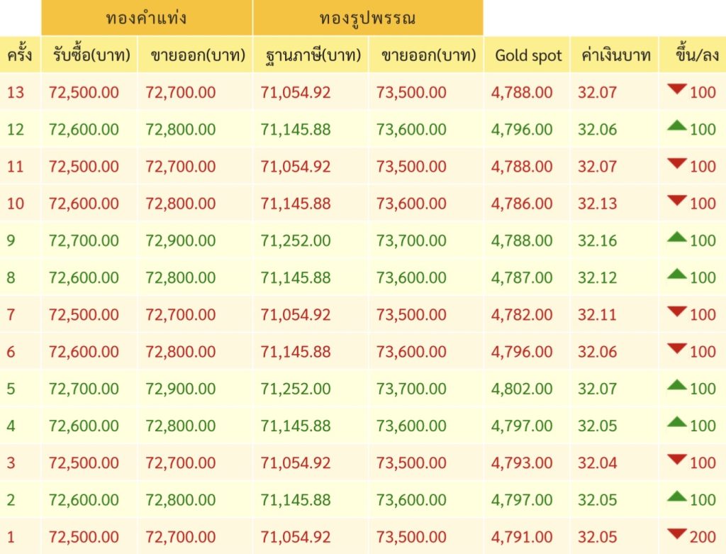 • ทองคำแท่งขายออกบาทละ 72,700 บาท