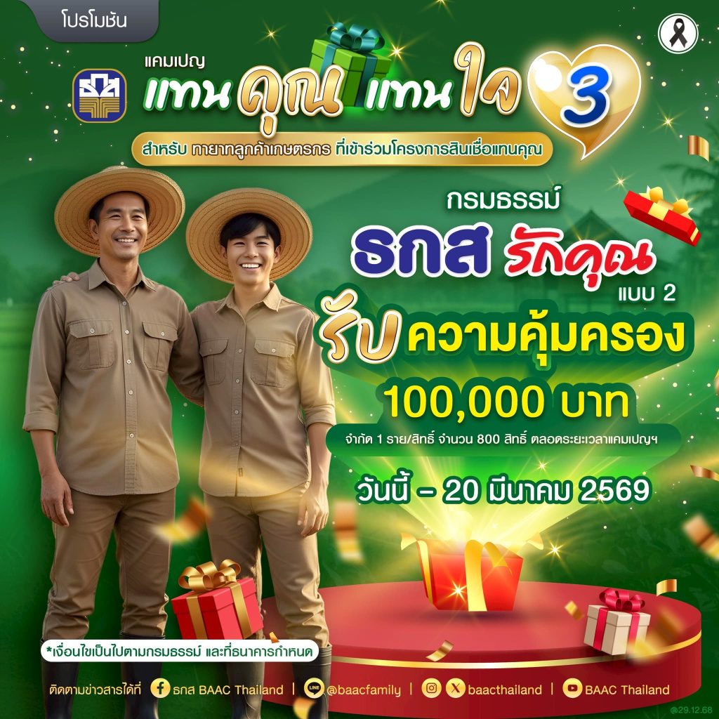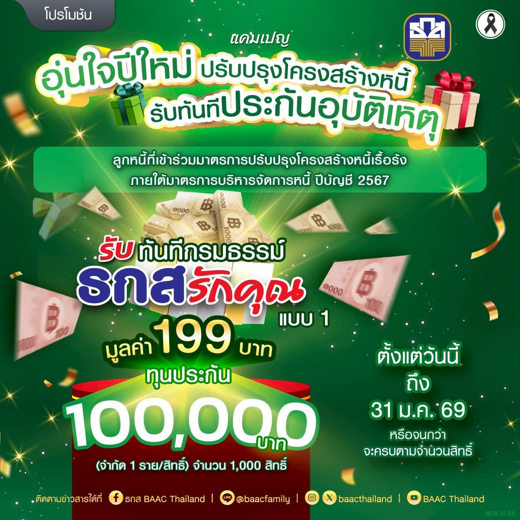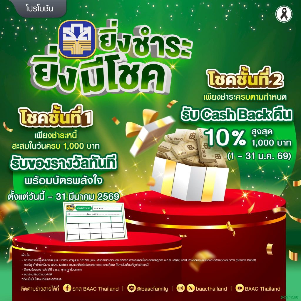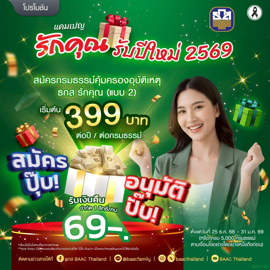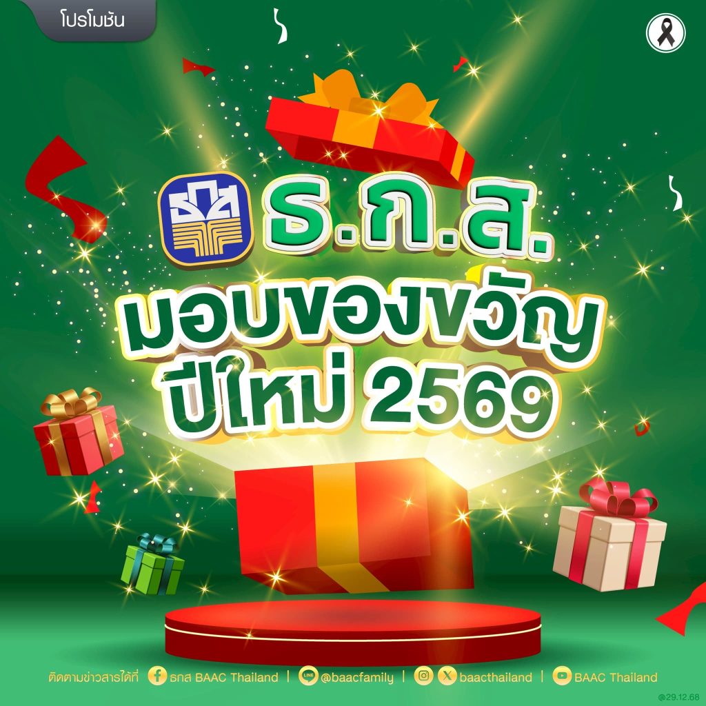 ธ.ก.ส. ส่งมอบของขวัญต้อนรับปีใหม่ 2569 ให้เกษตรกรลูกค้า ทั้งคืนดอกเบี้ย Cashback 10% ของยอดดอกเบี้ยที่ชำระสูงสุด 1,000 บาท การสะสมแต้มแลกของรางวัลฟรีที่สาขา รวมถึงการรับกรมธรรม์เงินฝากสงเคราะห์ชีวิต ธ.ก.ส. ที่ให้ความคุ้มครองสูงสุด 100,000 บาท ผ่านมาตรการชำระดีมีโชค โครงการสินเชื่อแทนคุณ แทนใจ และแคมเปญอุ่นใจปีใหม่ ปรับปรุงโครงสร้างหนี้ ตั้งแต่วันที่ 1 – 31 ม.ค. 69