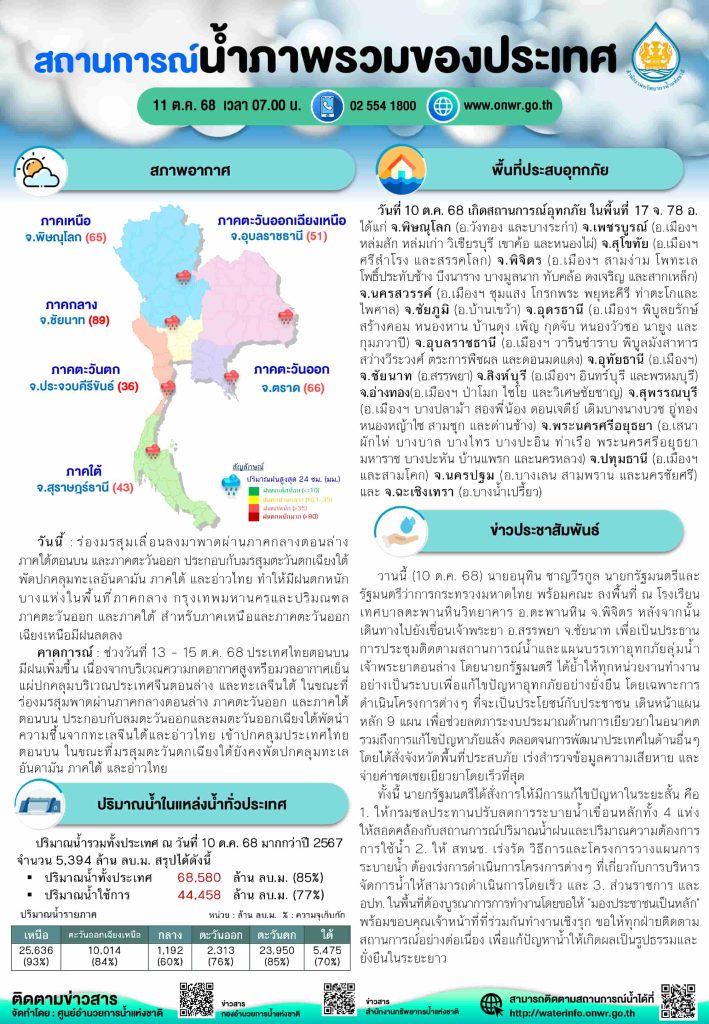 สรุปสถานการณ์น้ำภาพรวมของประเทศ วันที่ 11 ต.ค. 68