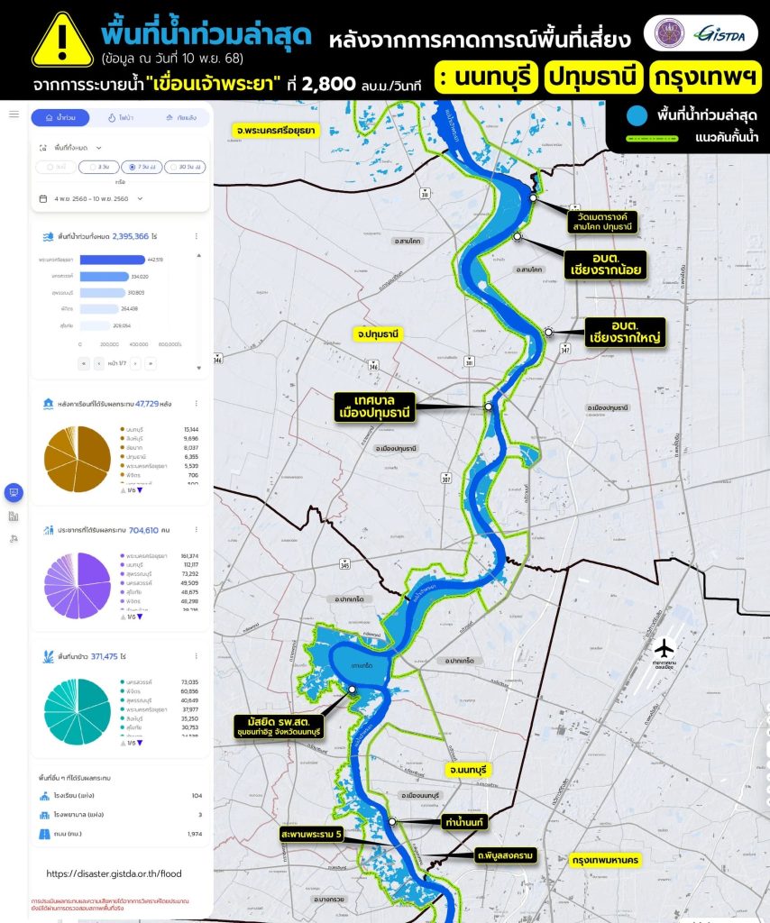 เจ้าพระยาท่วมตามคาด GISTDA ชี้ภาพจากดาวเทียมยืนยัน พื้นที่เสี่ยงน้ำท่วมใน “นนทบุรี–ปทุมธานี–กรุงเทพฯ” ถูกน้ำท่วมจริง พร้อมเตือนให้ประชาชนเฝ้าระวังเมื่อการระบายน้ำแตะ 2,900-3,000 ลบ.ม./วินาที ผลกระทบอาจขยายวงกว้าง / ข้อมูล 7 วันย้อนหลังทั้งประเทศท่วมแล้วกว่า 2.39 ล้านไร่