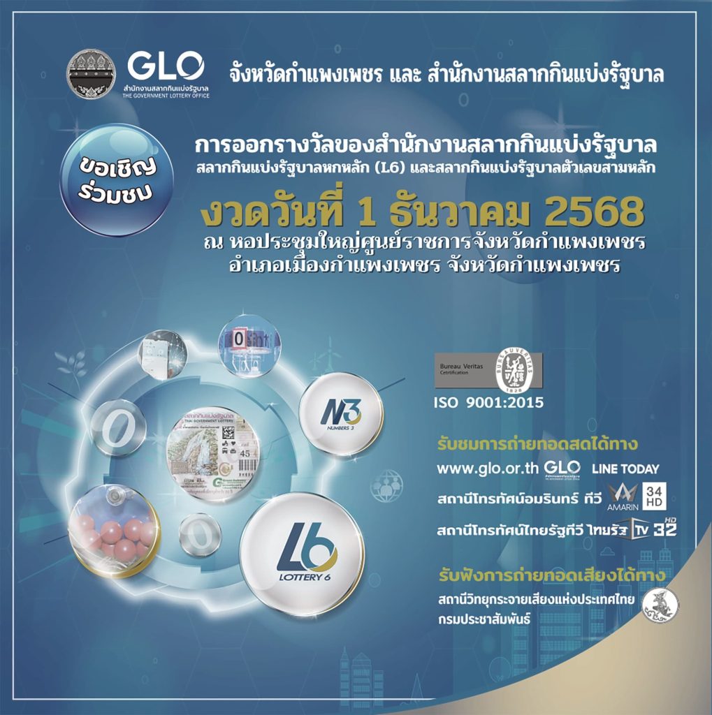 สำนักงานสลากกินแบ่งรัฐบาล (GLO) พร้อมออกสลากสัญจร งวดวันที่ 1 ธันวาคม 2568 ที่จังหวัดกำแพงเพชร เพื่อเปิดโอกาสให้ประชาชนในพื้นที่ได้เข้าร่วมรับชมขั้นตอนการออกรางวัล เพื่อแสดงถึงความโปร่งใสในขั้นตอนและกระบวนการในการออกรางวัลที่ได้รับการรับรองมาตรฐาน ISO 9001:2015