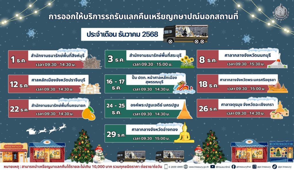 กรมธนารักษ์นำรถรับแลกคืนเหรียญกษาปณ์เคลื่อนที่ (Mobile Coin Unit) ออกให้บริการรับแลกคืนเหรียญกษาปณ์ให้บริการแก่ประชาชน ประจำเดือนธันวาคม 2568