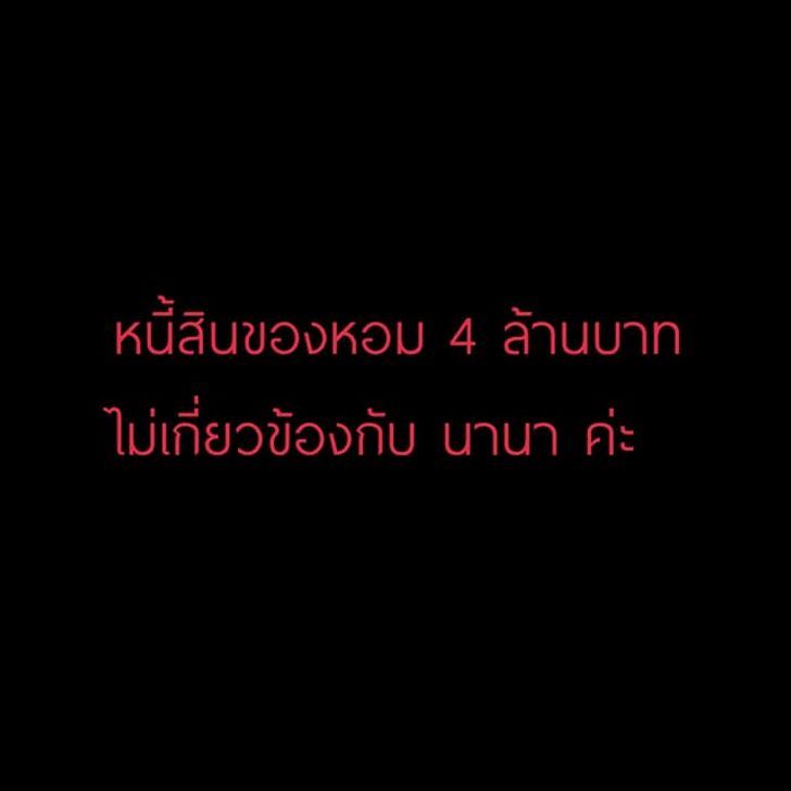 ทำเอา ดีเจต้นหอม ถึงกับต้องรีบออกมาชี้แจง ประเด็นเงิน 4 ล้านที่ก่อนหน้านี้ ดีเจต้นหอม ได้โพสต์ว่าโดนยืมเงินเป็นมูลค่าสูงถึง 4 ล้านบาท ไม่ได้เป็นการหลอกลงทุน และทำให้หลายคนเข้าใจผิดและโยงไปที่ นานา ไรบีนา ที่ตอนนี้ติดหนี้เพื่อนๆ อยู่ โดยล่าสุด ดีเจต้นหอม ได้ออกมาโพสต์ภาพข้อความชี้แจงแบบชัดเจนว่า “หนี้สินของหอม 4 ล้านบาท ไม่เกี่ยวข้องกับ นานา ค่ะ”