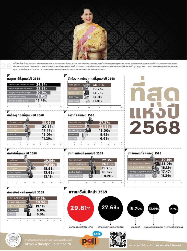“สวนดุสิตโพล” มหาวิทยาลัยสวนดุสิต เผยผลสำรวจความคิดเห็นของประชาชน กรณี “ที่สุดแห่งปี” โดยการเมืองที่สุดแห่งปี2568 อันดับ 1 รักชนก ศรีนอก 27.35% อันดับ 2 ณัฐพงษ์ เรืองปัญญาวุฒิ 26.08% อันดับ 3 อนุทิน ชาญวีรกูล 19.75% อันดับ 4 พริษฐ์ วัชรสินธุ 18.62% อันดับ 5 แพทองธาร ชินวัตร 8.20%
