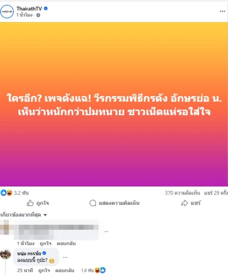วงการบันเทิงไม่ได้พักอีกแล้ว! เมื่อโลกโซเชียลกำลังร้อนฉ่าจากกรณี มีการขุดแฉวีรกรรมของ “พิธีกรชายชื่อดัง” ที่มีพฤติกรรมเรื่องซุกลูกเมีย เปย์เมียน้อยหลักล้าน แต่ให้ลูกเมียหลวงอยู่บ้านเก่าๆ ต้องบอกว่าแต่ละข้ออ่านแล้วทำขนลุกเลย งานนี้ทำเอาชาวเน็ตทำการบ้านกันหนักมากว่า “หวยจะไปออกที่ใคร?” กระแสข่าวร้อนดักล่าวหลายเพจหลายสื่อบันเทิงต่างหยิบนำมาบอกเล่า และเมื่อสื่อใหญ่อย่าง ไทยรัฐ TV ได้นำเสนอข่าวดังกล่าวพร้อมลงภาพประกอบเป็น “เงาปริศนา” ซึ่งมีชาวเน็ตเข้ามาคอมเมนต์กันอย่างหลากหลาย และหนึ่งในชาวเน็ตนั้นคือ “หนุ่ม กรรชัย” พิธีคนดังแห่งรายการโหนกระแส ได้โผล่คอมเมนต์อย่างฮาว่า “”ลงแบบนี้ กูป่ะ?” (พร้อมอีโมจิรูปกัดปาก) บอกเลยว่าชาวเน็ตใส่ใจเพิ่มขึ้นอีกเลย และเข้ามาแซวพ่อหนุ่ม พี่หน่วงกันอย่างสนั่นเลยจริงๆ