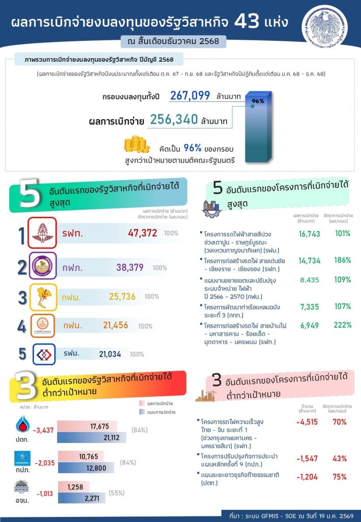 “ทุบสถิติ! รัฐวิสาหกิจโชว์ผลงานการเบิกจ่ายงบลงทุน ประจำปีบัญชี 2568 กว่า 2.56 แสนล้านบาท ทะลุ 96% ของกรอบงบลงทุน”