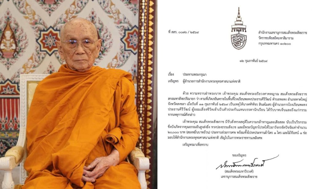 สมเด็จพระมหาวีรวงศ์ เลขานุการสมเด็จพระสังฆราช ได้มีหนังสือถึง ผอ.สำนักงานพระพุทธศาสนาแห่งชาติ เรื่อง ประทานพระกรุณา ระบุว่า ด้วย ความทราบฝ่าพระบาท เจ้าพระคุณ สมเด็จพระอริยวงศาคตญาณ สมเด็จพระสังฆราช สกลมหาสังฆปริณายก ว่า ตามที่เกิดภยันตรายในพื้นที่โรงเรียนพะตงประธานคีรีวัฒน์ ต.พะตง อ.หาดใหญ่ จ.สงขลา เมื่อวันที่ 11 ก.พ. 2569 เป็นเหตุให้นางศศิพัชร สินสโมสร ผอ.โรงเรียนพะตงประธานคีรีวัฒน์ ผู้ยอมเสี่ยงชีวิตเข้าเป็นตัวประกันแทนบรรดานักเรียน ได้รับบาดเจ็บและถึงแก่กรรม จากเหตุการณ์ดังกล่าว เจ้าพระคุณ สมเด็จพระสังฆราช มีรับสั่งทรงสดุดีในความกล้าหาญและเสียสละ นับเป็นวีรกรรม ซึ่งบังเกิดจากคุณธรรมอันสูงส่งยิ่ง ทรงปลงธรรมสังเวช และมีพระบัญชาโปรดให้ไวยาวัจกรจัดปัจจัยเท่าจำนวน 20,000 บาท ประทานช่วยงานศพ พร้อมทั้งโปรดประทานผ้าไตร 1 ไตร และไม้จันทน์ 1 ช่อ