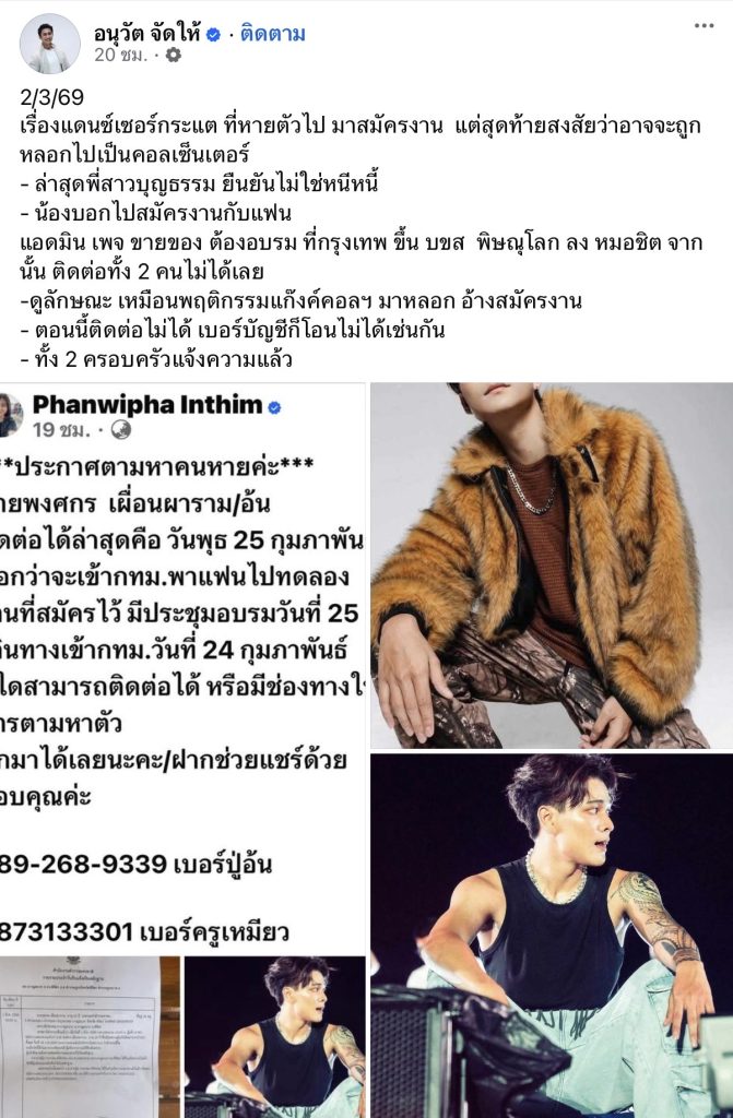 กลายเป็นข่าวที่สร้างความตกใจและน่าเป็นห่วงอย่างยิ่งในเวลานี้ เมื่อภัยสังคมคืบคลานเข้ามาใกล้ตัว ล่าสุดมีรายงานการหายตัวไปอย่างเป็นปริศนาของ “อ้น-พงศกร เผื่อนผาราม” แดนเซอร์หนุ่มของนักร้องลูกทุ่งสาวชื่อดัง “กระแต อาร์สยาม” ท่ามกลางความกังวลใจของครอบครัวว่า เจ้าตัวและแฟนสาวอาจตกเป็นเหยื่อของขบวนการหลอกลวงไปทำงานที่ประเทศเพื่อนบ้าน เรื่องราวนี้ถูกตีแผ่เพื่อขอความช่วยเหลือผ่านทางแฟนเพจเฟซบุ๊กของผู้ประกาศข่าวชื่อดัง “อนุวัติ จัดให้” ซึ่งได้ออกมาแจ้งข่าวร้ายนี้เพื่อให้สังคมช่วยกันเป็นหูเป็นตา โดยระบุไทม์ไลน์ว่า หนุ่มอ้นและแฟนสาวได้เดินทางเข้ากรุงเทพมหานครตั้งแต่วันที่ 24 ก.พ. เพื่อเตรียมตัวทดลองงานและอบรมในวันที่ 25 ก.พ. แต่หลังจากวันนั้นก็ขาดการติดต่อไปโดยสิ้นเชิง