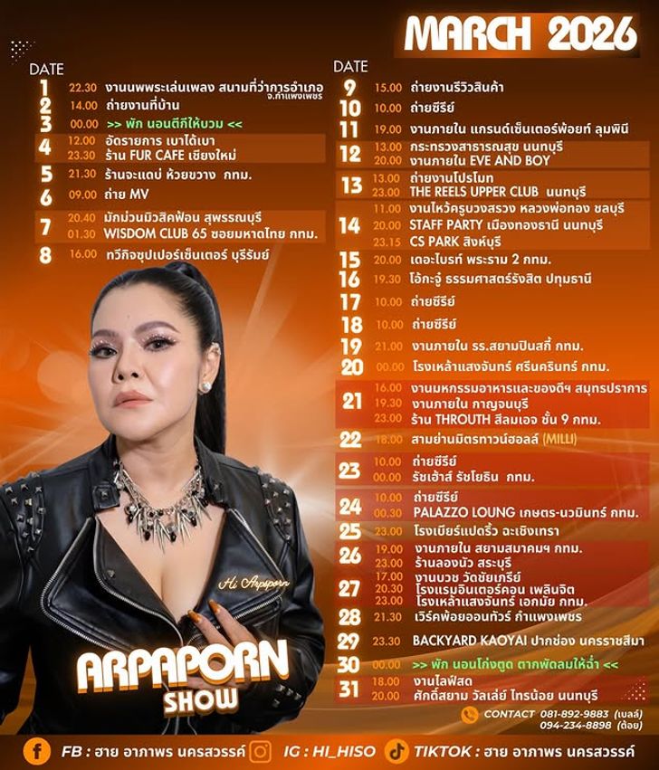 ตัวแม่ลูกทุ่งไทยที่วินาทีนี้ฮอตข้ามรุ่นครองใจชาว Gen Z ไปเรียบร้อยแล้ว สำหรับ “ฮาย อาภาพร นครสวรรค์” ที่ล่าสุดทำเอาโซเชียลสั่นสะเทือนอีกครั้ง หลังออกมาเปิดเผยตารางคิวงานประจำเดือนมี.ค.ที่เห็นแล้วต้องยอมใจในความ “คิวทอง” เพราะตารางแน่นเอี๊ยดแทบไม่มีวันว่าง แต่สิ่งที่ทำให้แฟนคลับและชาวเน็ตต้องหลุดโฟกัส จนกลายเป็นไวรัลเพียงชั่วข้ามคืน ไม่ใช่จำนวนงานที่ล้นหลาม แต่เป็นหมายเหตุในตารางงาน วันที่ 3 มี.ค. ที่เจ้าตัวเขียนระบุไว้ชัดเจนว่า “พัก นอนตี…ให้บวม” โอ๊ย! แม่อ่านแล้วสะดุ้งเลย