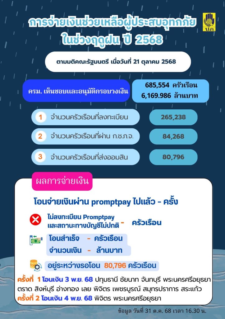 โดย ปภ. ได้รายงานผู้ลงทะเบียนเงินช่วยเหลือผู้ประสบอุทกภัยในช่วงฤดูฝน ปี 2568 จำนวนทั้งสิ้น 265,238 ครัวเรือน ผ่านคณะกรรมการให้ความช่วยเหลือผู้ประสบภัยพิบัติจังหวัด (ก.ช.ภ.จ.) จำนวนทั้งสิ้น 84,268 ครัวเรือน และส่งธนาคารออมสิน จำนวนทั้งสิ้น 80,796 ครัวเรือน จำนวนเงิน 727,164,000 บาท