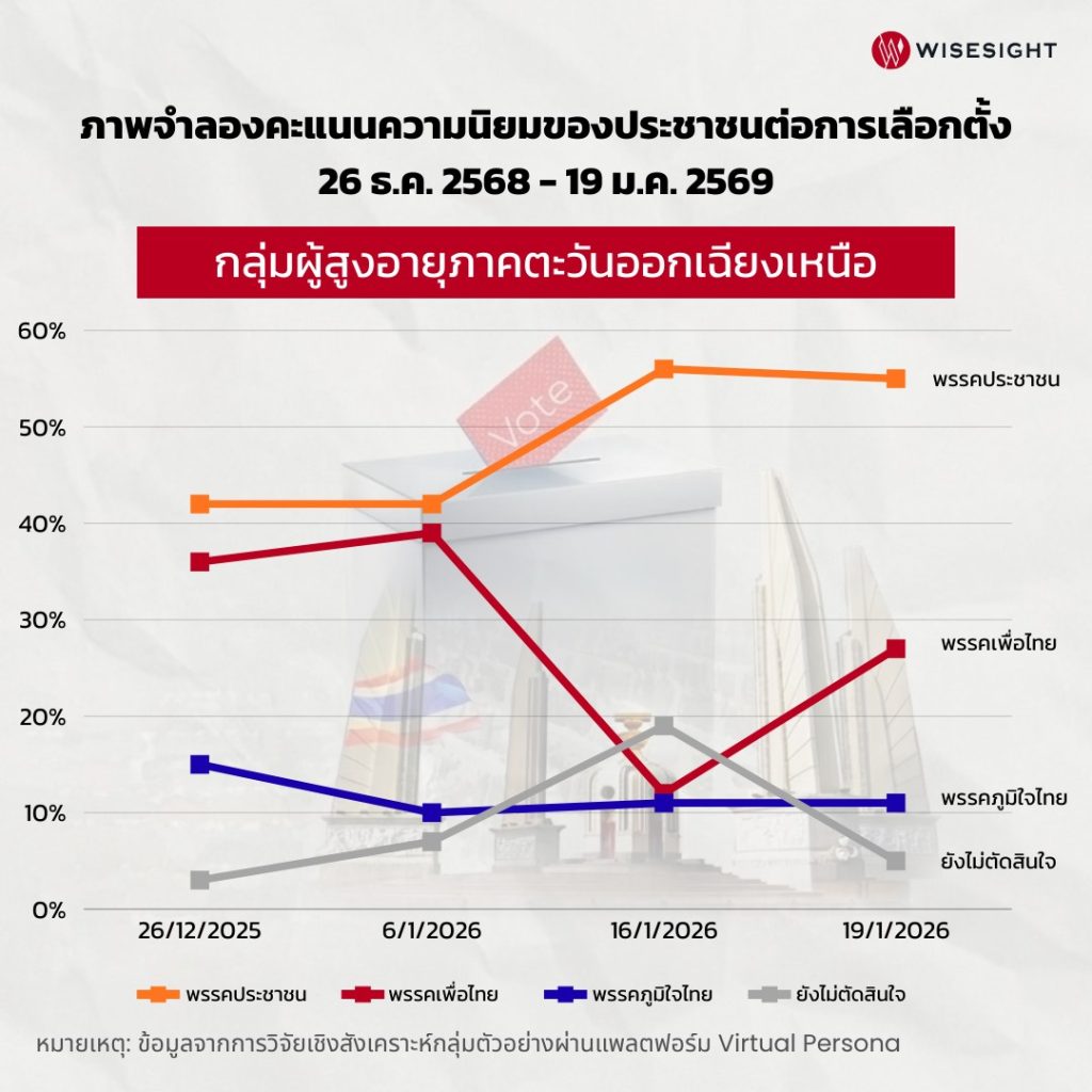 พรรคประชาชน สามารถก้าวขึ้นมาเป็นผู้นำในพื้นที่ที่เคยเป็นฐานที่มั่นสำคัญของขั้วอำนาจเดิมได้อย่างโดดเด่น จากคะแนนเริ่มต้นที่ 42% ในช่วงปลายปี 2568 พุ่งสูงขึ้นเป็น 55-56% ในช่วงเดือนมกราคม แสดงถึงการขยายฐานเสียงเข้าสู่กลุ่มผู้สูงวัยในภาคอีสานได้อย่างมีนัยสำคัญ