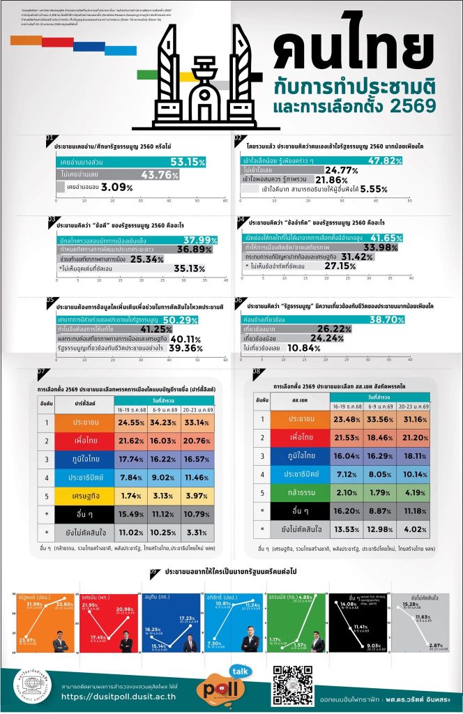 (25 ม.ค.69) “สวนดุสิตโพล” มหาวิทยาลัยสวนดุสิต เผยผลสำรวจความคิดเห็นประชาชนทั่วประเทศ เรื่อง “คนไทยกับการทำประชามติและการเลือกตั้ง 2569” ดังนี้