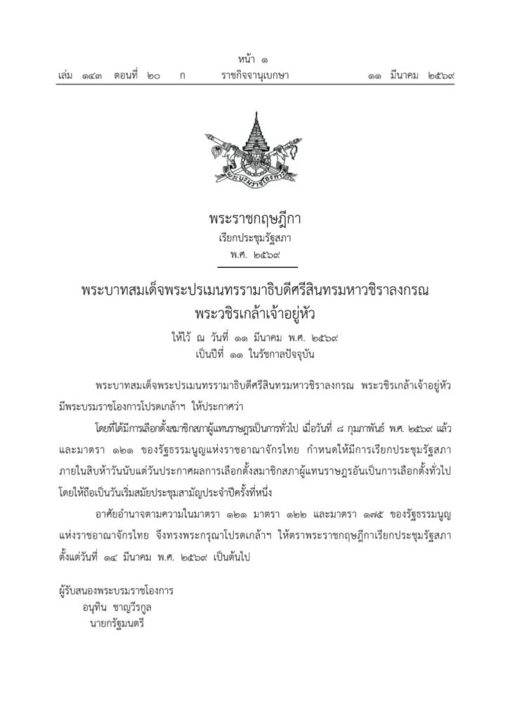 (11 มีนาคม) เว็บไซต์ราชกิจจานุเบกษา เผยแพร่พระราชกฤษฎีกาเรียกประชุมรัฐสภา พ.ศ. 2569 ความว่า พระบาทสมเด็จพระปรเมนทรรามาธิบดีศรีสินทรมหาวชิราลงกรณ พระวชิรเกล้าเจ้าอยู่หัว มีพระบรมราชโองการโปรดเกล้าฯ ให้ประกาศว่า