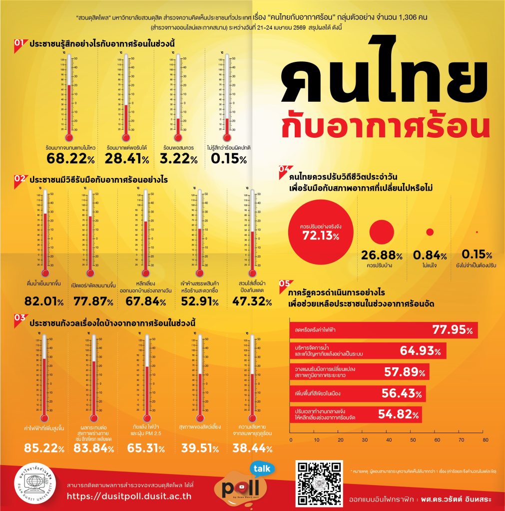 (26 เม.ย.69) “สวนดุสิตโพล” มหาวิทยาลัยสวนดุสิต สำรวจความคิดเห็นประชาชนทั่วประเทศ เรื่อง “คนไทยกับอากาศร้อน” 2569 สรุปผลได้ดังนี้