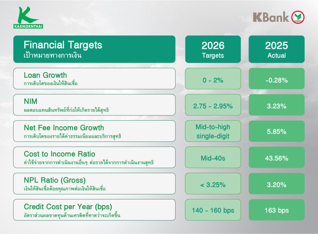 KASIKORNBANK (KBank) has announced its 2026 financial targets, aiming for balanced growth amid ongoing economic challenges. The Bank is moving forward to elevate the K-Strategy 3+1 and Productivity to the next level through a Customer Strategy, while fostering deeper and more sustainable relationships across all customer segments. The Bank is committed to delivering financial solutions that precisely meet the customers’ needs at the right moment, driving the Bank, customers and all stakeholders to grow together with balance and sustainability over the long term.