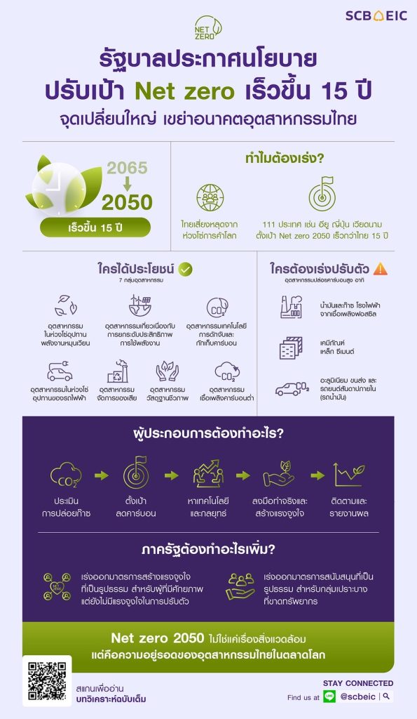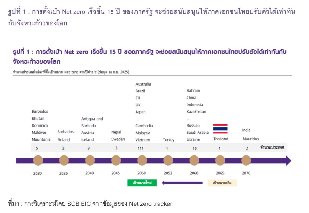 การขยับเป้า Net zero เป็นปี 2050 ถือเป็นก้าวสำคัญที่จะช่วยให้อุตสาหกรรมไทยปรับตัวสู่เศรษฐกิจคาร์บอนต่ำได้เท่าทันโลก โดยหากไทยยังคงเป้าหมายเดิมไว้ในปี 2065 จะทำให้ไทยบรรลุ Net zero ช้ากว่า 111 ประเทศถึง 15 ปี และเสี่ยงหลุดจากวงจรการค้าโลกในอนาคต เนื่องจากประเทศและบริษัทต่าง ๆ ที่มีเป้า Net zero 2050 มีแนวโน้มที่จะเลือกซื้อสินค้าและบริการเฉพาะจากประเทศและบริษัทที่มีเป้าหมาย Net zero ไม่ช้าไปกว่าเป้าหมายที่ประเทศหรือบริษัทของตนเองกำหนดไว้ ดังนั้น การประกาศเป้าใหม่เป็นปี 2050 ซึ่งสอดคล้องกับข้อเสนอจากงานศึกษาของ SCB EIC ในปี 2024จึงเป็นกุญแจสำคัญที่จะช่วยผลักดันให้ภาคเอกชนปรับตัวได้เท่าทันโลกเนื่องจากการเปลี่ยนผ่านสู่เศรษฐกิจคาร์บอนต่ำจำเป็นต้องอาศัยแรงส่งจากภาครัฐอย่างจริงจังตลอดช่วงเวลา 25 ปีข้างหน้า ทั้งนี้แม้เป้าหมายใหม่จะถือเป็นความก้าวหน้า แต่ในระดับโลก ไทยเพียงแค่ “กลับเข้าสู่มาตรฐานสากล”เช่นเดียวกับ ญี่ปุ่น สหภาพยุโรป และเวียดนาม ที่ได้ประกาศ Net zero 2050 ไปก่อนแล้ว ซึ่งเป้าหมายใหม่นี้เป็นความท้าทายและโจทย์สำคัญที่ผู้ประกอบการไทยต้องเร่งปรับตัว