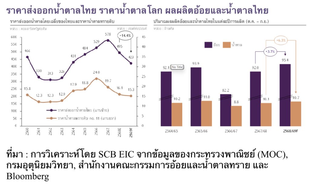 SCB EIC คาดว่า รายได้ของอุตสาหกรรมน้ำตาลในปี 2569 มีแนวโน้มพลิกกลับมาหดตัว โดยได้รับแรงกดดันจากราคาน้ำตาลที่มีแนวโน้มปรับตัวลดลงค่อนข้างมาก แม้ปริมาณผลผลิตจะเพิ่มขึ้น โดยคาดว่าปริมาณผลผลิตน้ำตาลไทยในปีการผลิต 2568/2569 จะเพิ่มขึ้น 6.3% จากปีการผลิต 2567/2568 มาอยู่ที่ 10.7 ล้านตัน ตามปริมาณอ้อยเข้าหีบที่จะเพิ่มขึ้นมาอยู่ที่ 95.4 ล้านตัน จากปริมาณน้ำฝนที่มากกว่าปกติในหลายพื้นที่ ในขณะที่ราคาส่งออกน้ำตาลของไทยโดยเฉลี่ยในปี 2569 จะลดลง 14.4%YOY มาอยู่ที่ 423 ดอลลาร์สหรัฐต่อตัน สอดคล้องกับราคาน้ำตาลในตลาดโลกที่จะลดลงมาอยู่ที่ 15.3 เซนต์ต่อปอนด์ เนื่องจากตลาดน้ำตาลโลกมีแนวโน้มกลับมาเผชิญภาวะเกินดุล จากผลผลิตโลกที่เติบโตดี ตามสภาพภูมิอากาศที่เอื้ออำนวย โดยเฉพาะในอินเดียซึ่งเป็นผู้ผลิตน้ำตาลอันดับ 2 ของโลก ที่ผลผลิตจะเพิ่มขึ้น 19.9% จากปีการผลิตที่ผ่านมา นอกจากนี้ เศรษฐกิจโลกที่เติบโตชะลอลงจากนโยบายภาษีตอบโต้ของทรัมป์ ยังส่งผลให้ความต้องการใช้น้ำตาลโลกเติบโตต่ำ กดดันราคาน้ำตาลในตลาดโลก ซึ่งราคาน้ำตาลที่ลดลงจะส่งผลให้มูลค่าการส่งออกน้ำตาลของไทยในปี 2569 หดตัว 9.0%YOY จากที่จะขยายตัว 27.3%YOY ในปี 2568ทั้งนี้มูลค่าการส่งออกจะลดลงไม่มาก เนื่องจากปริมาณการส่งออกน้ำตาลในปี 2569 จะเพิ่มขึ้น 6.3%YOY ตามผลผลิตน้ำตาลของไทยที่จะปรับตัวเพิ่มขึ้น ประกอบกับเอเชียยังมีผลผลิตน้ำตาลไม่เพียงพอต่อความต้องการบริโภคในภูมิภาค ทำให้ต้องพึ่งพาการนำเข้าจากไทย ทั้งนี้ยังต้องจับตาความเสี่ยงจากภาวะเศรษฐกิจโลกที่จะส่งผลกระทบต่อราคาน้ำตาลโลก ความแปรปรวนของสภาพภูมิอากาศที่จะกระทบต่อผลผลิตและราคาน้ำตาล และปัญหาความขัดแย้งไทย–กัมพูชา ที่จะกระทบต่อการผลิตและการส่งออกน้ำตาลของไทย