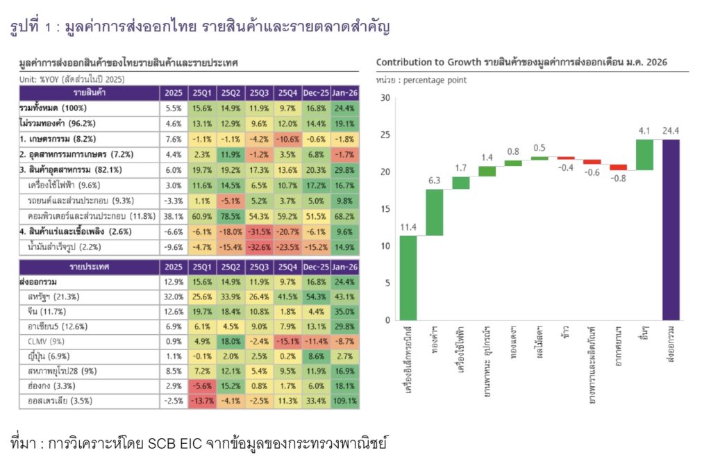 ส่งออกไทย ม.ค. 2026 โตแรงสุดในรอบ 4 ปี แต่ระยะต่อไปเผชิญความไม่แน่นอนสูงขึ้นจากมาตรการภาษีที่สหรัฐฯ จะนำมาใช้เพิ่มเติม