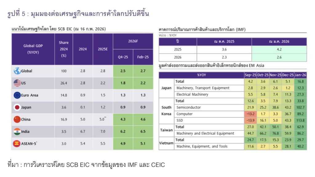 SCB EIC ปรับประมาณการส่งออกไทยกลับมาขยายตัวได้ 1.6% ในปี 2026(เดิม -1.5%) ตามแรงหนุนวัฏจักรสินค้าอิเล็กทรอนิกส์ยังมีต่อเนื่องจากความต้องการที่สูงขึ้นทั่วโลก สนับสนุนการส่งออกของหลายประเทศเอเชียรวมถึงไทย ซึ่งเป็นผู้ผลิตสำคัญในสินค้าดังกล่าว สะท้อนได้จากรูปที่ 5 ขวาล่าง ที่มูลค่าส่งออกของประเทศกำลังพัฒนาเอเชียยังขยายตัวดีต่อเนื่อง โดยเฉพาะสินค้าอิเล็กทรอนิกส์ เช่น ไต้หวัน เกาหลีใต้ เวียดนาม และไทย นอกจากนี้ มุมมองต่อเศรษฐกิจและการค้าโลกปรับดีขึ้น โดย SCB EIC ได้ปรับเพิ่มคาดการณ์อัตราการขยายตัวเศรษฐกิจโลกปี 2026 ขึ้นเป็น 2.7% (เดิม 2.5%) ขณะที่กองทุนการเงินระหว่างประเทศ (IMF) และองค์การการค้าโลก (WTO) ปรับคาดการณ์ปริมาณการค้าโลกในปี 2026 สูงขึ้นเช่นเดียวกันจากมุมมองต่อเศรษฐกิจโลกที่ดีขึ้น รวมถึงมองว่าการพัฒนา AI ที่รวดเร็วจะเป็นปัจจัยหนุนการค้าโลกปีนี้ และช่วยลดผลกระทบภาษีสหรัฐฯ