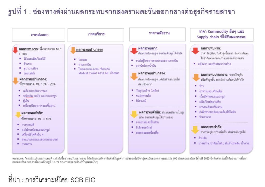 SCB EIC ประเมินว่าสงครามในตะวันออกกลางจะส่งผลกระทบต่อภาคธุรกิจไทยในหลายมิติ ทั้งทางตรงและทางอ้อม โดยรวมแม้ไทยจะส่งออกไปตะวันออกกลางค่อนข้างน้อย แต่มีบางอุตสาหกรรมพึ่งพาตลาดตะวันออกกลางในสัดส่วนที่ค่อนข้างมาก ทำให้จะยังคงได้รับผลกระทบ เช่น สินค้าเกษตรและอาหารบางประเภท และรถยนต์นั่ง ขณะที่ธุรกิจอื่น ๆ แม้ไม่ได้พึ่งพาตลาดตะวันออกกลางมากนัก แต่หลายธุรกิจอาจได้รับผลกระทบจากแรงกดดันด้านต้นทุนพลังงานที่มีแนวโน้มปรับตัวเพิ่มขึ้น โดยเฉพาะธุรกิจที่พึ่งพาน้ำมันเป็นสัดส่วนสูง อาทิ กลุ่มพลังงาน ขนส่ง ก่อสร้างและวัสดุก่อสร้าง รวมถึงธุรกิจส่งออกที่อาจเผชิญปัญหาด้านการขนส่งที่อาจล่าช้าและมีค่าใช้จ่ายเพิ่มขึ้น