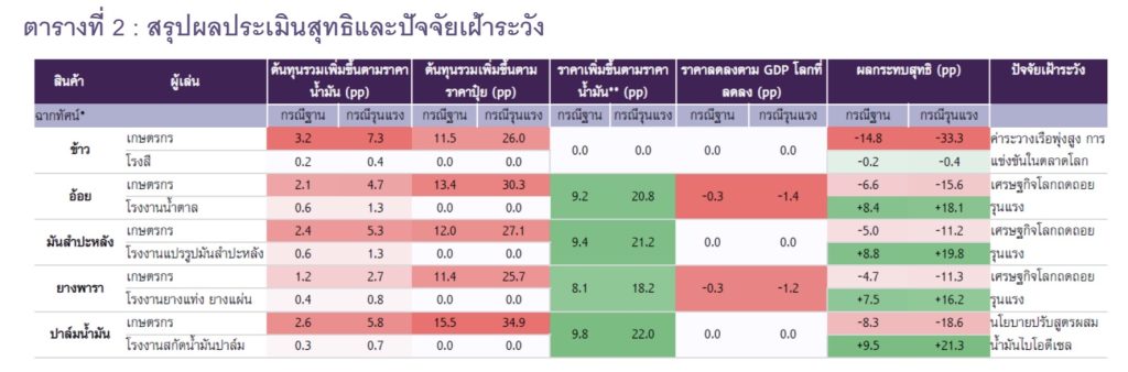 *กรณีฐาน น้ำมัน +35 pp (80 ดอลลาร์สหรัฐต่อบาร์เรล) ราคาปุ๋ย +28.6 pp GDP โลก -0.2 pp, กรณีรุนแรง น้ำมัน + 79 pp (110 ดอลลาร์สหรัฐต่อบาร์เรล) ราคาปุ๋ย +64.5 pp GDP โลก -0.9 pp และสูตรการคำนวณมีดังนี้ ผลกระทบสุทธิ (percentage point ที่เปลี่ยนแปลงไปจากค่าเดิม) = [ราคาน้ำมันที่เพิ่มขึ้น × ความอ่อนไหวของราคาต่อราคาน้ำมัน] − [ราคาน้ำมันที่เพิ่มขึ้น × สัดส่วนต้นทุนน้ำมัน] – [ราคาปุ๋ยที่เพิ่มขึ้น x สัดส่วนต้นทุนปุ๋ย] + [GDP โลกที่เปลี่ยนแปลง × ความอ่อนไหวของราคาต่อ GDP โลก]