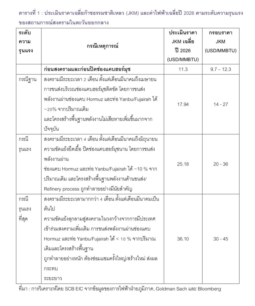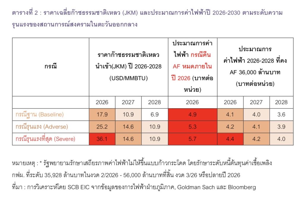 SCB EIC ประเมินว่าด้วยการเร่งจัดหาก๊าซฯทดแทนในตลาดจรที่ราคาLNG สูงขึ้นจะส่งผลให้ต้นทุนค่าไฟฟ้าของประเทศไทยเพิ่มขึ้นและทรงตัวในระดับสูงอย่างน้อย2 ปี จากก่อนสถานการณ์สงคราม ประเมินว่าราคา LNG (JKM)นำเข้าเฉลี่ยในปี 2026 จะอยู่ที่ระดับ 11.3 ดอลลาร์สหรัฐต่อล้านบีทียูและประเมินว่าค่าไฟฟ้าช่วงปี 2026 จะอยู่ที่ราว 3.9 บาทต่อหน่วย แต่หลังจากเกิดความขัดแย้งในตะวันออกกลาง ในกรณีฐาน (Baseline) ประเมินว่าราคา LNG (JKM) นำเข้าเฉลี่ยในปี 2026 จะเพิ่มขึ้นมาอยู่ที่ระดับ 17.9 ดอลลาร์สหรัฐต่อล้านบีทียูซึ่งจะทำให้ส่วนของประมาณการค่าเชื้อเพลิง และค่าซื้อไฟฟ้าของ กฟผ. (EFC) สูงขึ้นจากที่ก๊าซธรรมชาติเป็นเชื้อเพลิงหลักในการผลิตไฟฟ้าซึ่งมีสัดส่วนมากถึง 54% ของแหล่งพลังงานทั้งหมดในการผลิตไฟฟ้า ประกอบกับภาระต้นทุนค่าไฟฟ้าค้างรับสะสม (Accumulated Factor หรือค่า AF) ทั้งหมด 35,928 ล้านบาทที่ต้องชำระคืน ทำให้ค่าไฟฟ้าผันแปร (Ft) ปรับตัวสูงขึ้นตามไปด้วย (รายละเอียดสูตรโครงสร้างค่าไฟฟ้าใน Box ที่ 1) ด้วยปัจจัยดังกล่าวจะทำให้ค่าไฟฟ้าเพิ่มสูงถึง 4.9 บาทต่อหน่วยในปลายปี 2026 อย่างไรก็ดี จากประมาณการค่าไฟฟ้าภายใต้สมมติฐานว่า หากรัฐขอให้ กฟผ. รับภาระต้นทุนค่าไฟฟ้าค้างรับสะสม (AF) ไว้ก่อนที่ระดับเดิมราว 36,000 ล้านบาท ในปลายปี 2026 เพื่อบรรเทาผลกระทบจากการเร่งตัวของค่าไฟฟ้าซึ่งจะส่งผลให้ประมาณการค่าไฟฟ้าเฉลี่ยปี 2026 จะอยู่ที่ราว 4.1 บาทต่อหน่วยและอยู่ในระดับ 4 บาทต่อหน่วยในปี 2027 (รายละเอียดในตารางที่ 2) แต่หากสถานการณ์สงครามรุนแรงขึ้นถึงขั้นรุนแรงมาก (Severe) จนเกิดความขัดแย้งลุกลามในวงกว้าง การขนส่งพลังงานผ่านช่องแคบฮอร์มุซและท่อ Yanbu/Fujairah ได้ < 10 % และโครงสร้างพื้นฐานด้านพลังงานถูกทำลาย จะทำให้ระดับราคา LNG (JKM) นำเข้าปี 2026 พุ่งสูง เฉลี่ยที่ระดับ 36.1 ดอลลาร์สหรัฐต่อล้านบีทียู จะทำให้ค่าไฟฟ้าเพิ่มสูงถึง 5.7 บาทต่อหน่วยในปลายปี 2026 แต่หากรัฐขอให้ กฟผ. รับภาระค่า AF ไว้ก่อนจะส่งผลให้ค่าไฟฟ้าเฉลี่ยในช่วงปี 2026-2027 อยู่ที่ระดับราว 4.3 บาทต่อหน่วย โดยค่าไฟฟ้าปี 2026 อยู่ที่ระดับ 4.4 บาทต่อหน่วยและปี 2027 อยู่ที่ระดับ 4.2 บาทต่อหน่วย (รายละเอียดในตารางที่ 2)